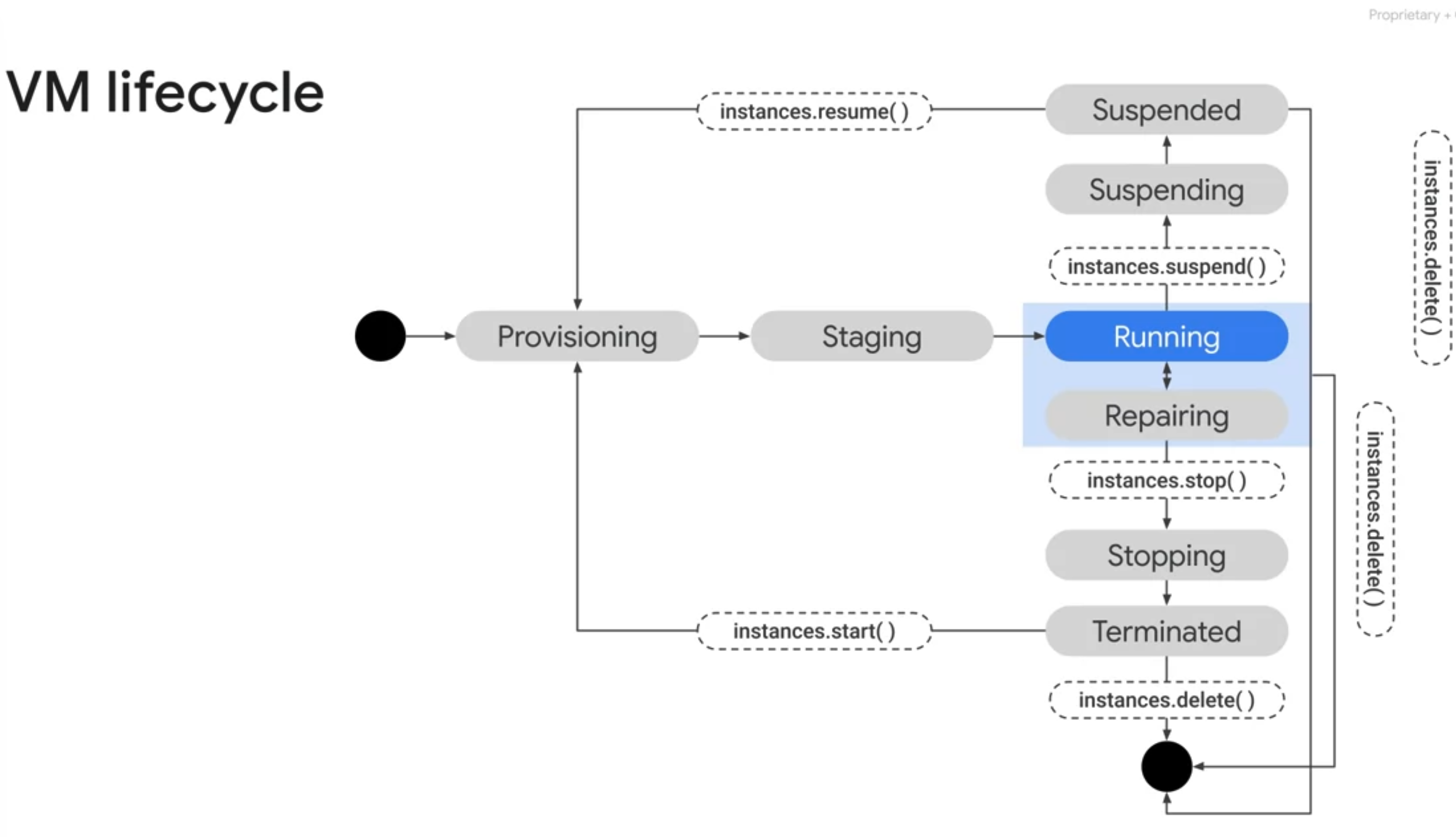 lifecycleincludesstatessuch asprovisioning, staging, running, and terminated. Each state represents adifferent phaseof the VM's existence. -